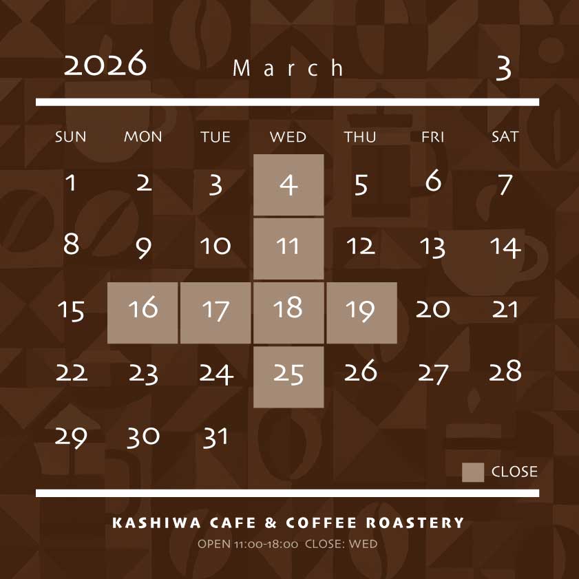 3月の営業について 2026 2/12 2026年2月12日 2026年2月12日 水曜定休 に加え16日 月曜日〜19日木曜日 設備メンテナンスのため 休業とさせていただきます KASHIWA CAFE & COFFEE ROASTERYOPEN 11:00-18:00 <水曜日 定休> 営業について 2/2、2/3営業開始時間変更のお知らせ この記事を書いた人 kashiwa25 関連記事 2月の営業日程について 2026年1月19日 1月の営業日程について 2025年12月27日 12月の営業日程について 2025年11月17日 11月の営業日程について 2025年10月21日 10月の営業日程について 2025年9月29日 9月の営業日程について 2025年8月24日 8月の営業日程について 2025年7月18日 7月の営業日程について 2025年6月23日